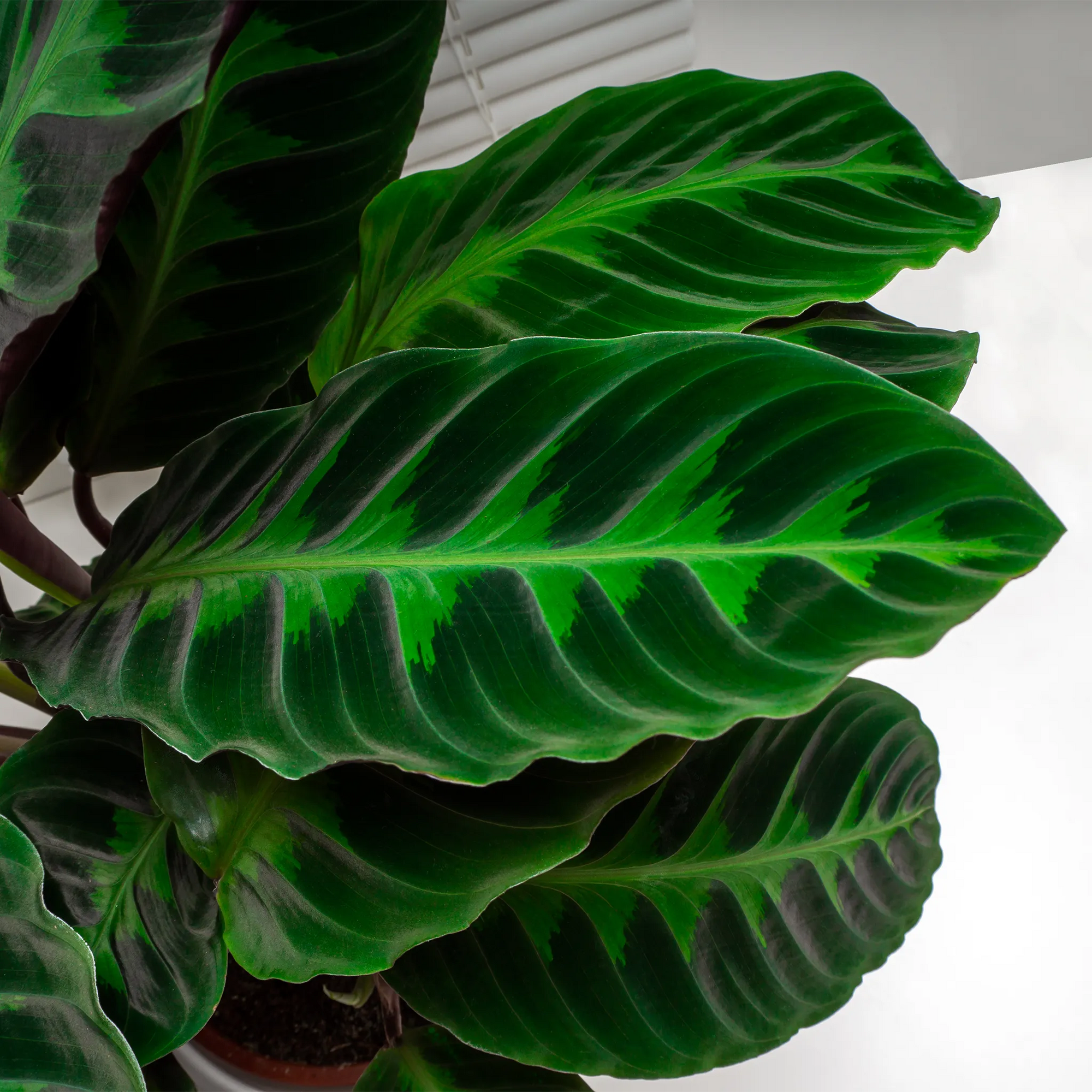 Calathea warscewiczii, often called the Velvet Calathea, is a spectacular tropical plant prized for its lush, velvety foliage. The leaves are deep green with lighter feather-like patterns and contrasting burgundy undersides, giving it a rich, luxurious look. Its texture sets it apart from many other Calatheas, adding both visual and tactile appeal. Though it occasionally produces white flowers indoors, it is most valued for its striking foliage and upright growth habit. Like other prayer plants, its leaves follow a day–night rhythm, folding upwards in the evening. With consistent moisture, high humidity, and filtered indirect light, this plant thrives as an elegant centerpiece in any interior.