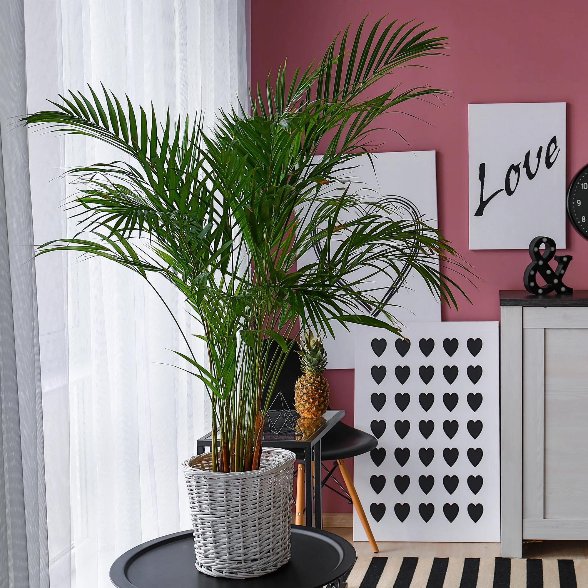 Dypsis lutescens, commonly called the Areca Palm or Butterfly Palm, is one of the most popular palms for indoor decoration. Its multiple slender canes and feathery, arching fronds create a soft, elegant look that instantly transforms interiors with a tropical atmosphere. Highly valued as an air-purifying plant, it also adapts well to indoor conditions, thriving in bright, indirect light with moderate watering and average household humidity. While it can grow quite tall over time, it remains manageable as a long-lived houseplant and provides a lush, natural screen in larger rooms.
