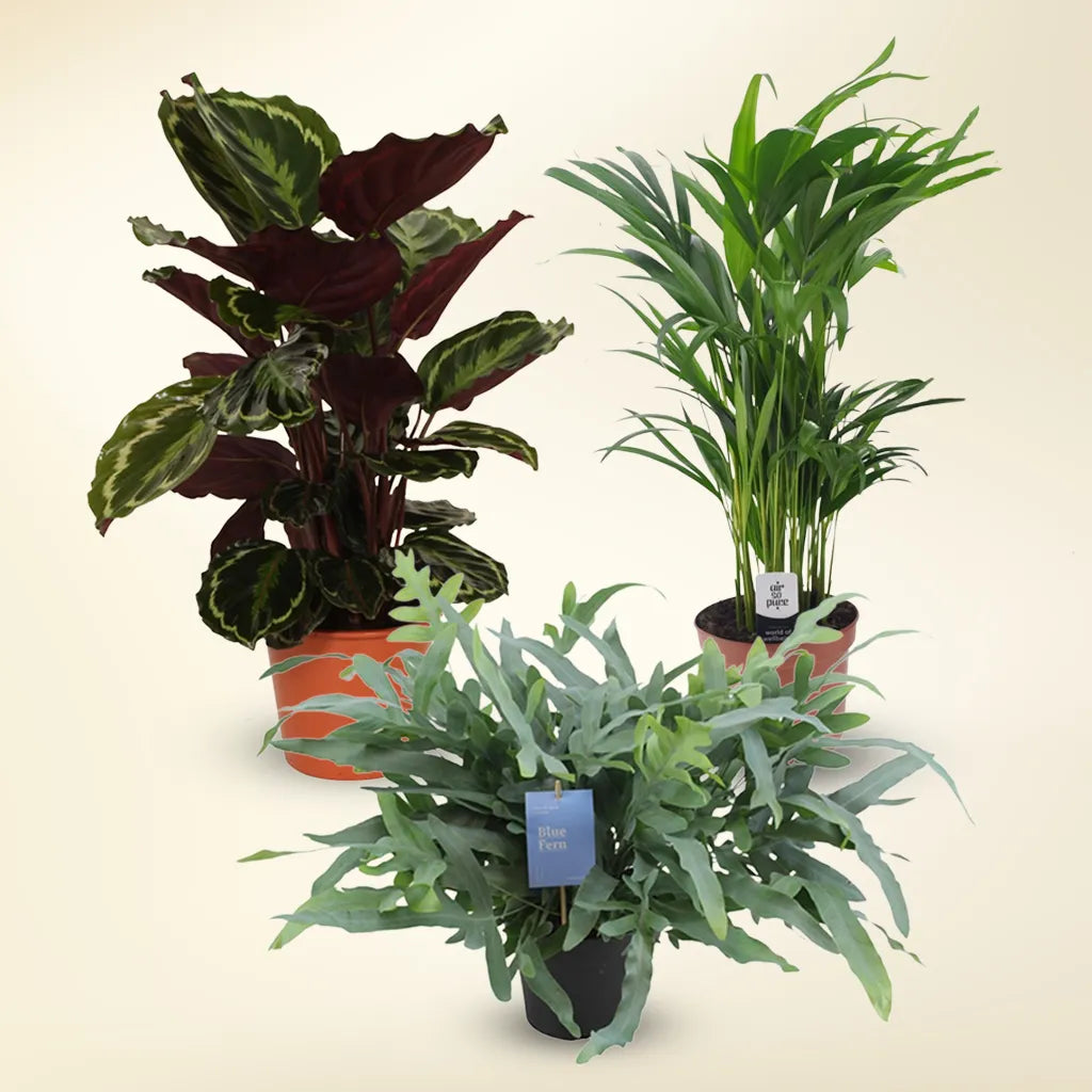 The Urban Jungle Oasis bundle is designed to create a rich, tropical atmosphere indoors while remaining completely pet-friendly. By combining palms, expressive foliage plants, and soft ferns, this bundle delivers depth, texture, and height — the key ingredients of a true indoor jungle.