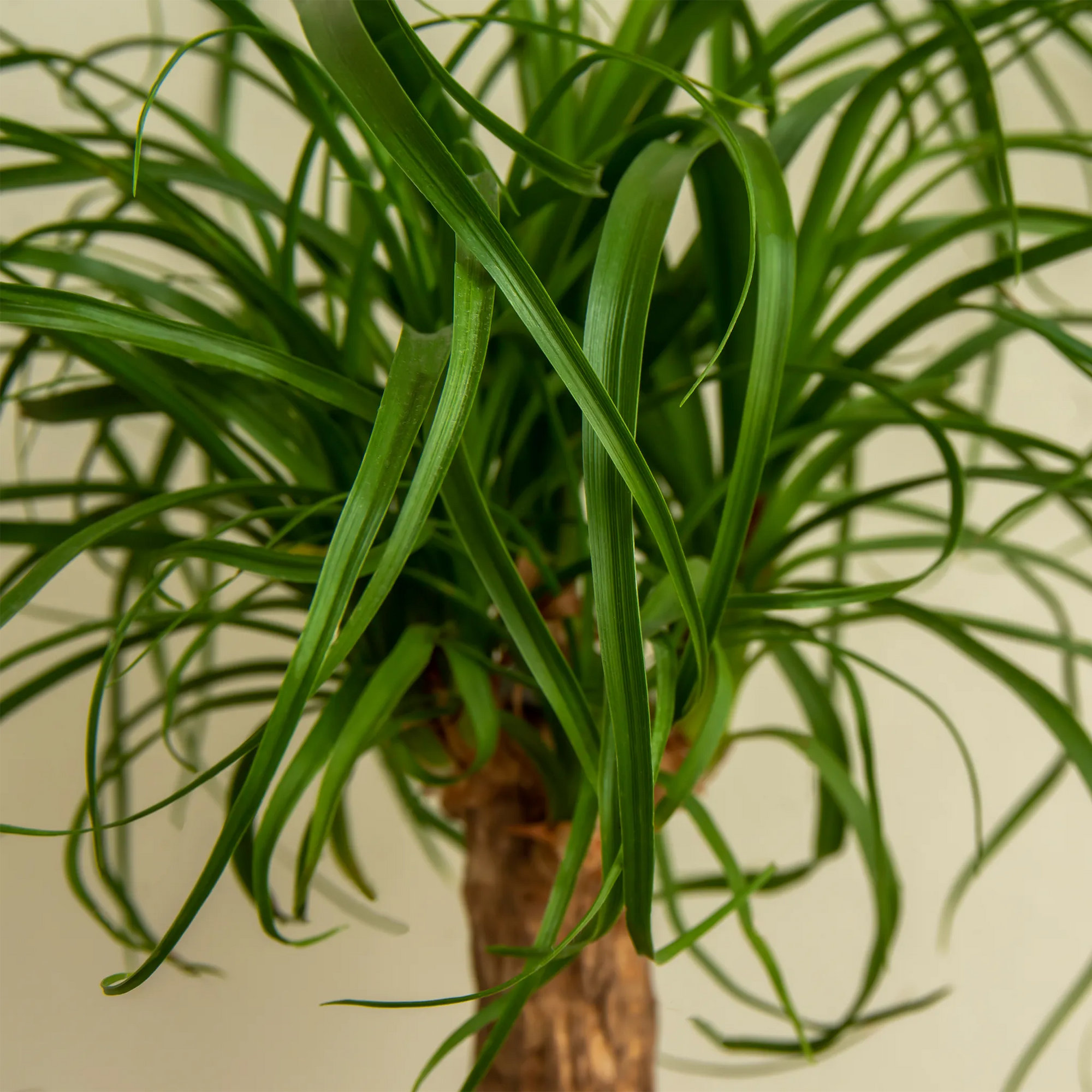 Beaucarnea recurvata, souvent appelée Pied d’éléphant ou Palmier queue-de-cheval, est une plante robuste et très décorative, facilement reconnaissable à sa base renflée qui stocke l’eau et à ses longues feuilles arquées retombant gracieusement comme une fontaine. Bien que surnommée « palmier », ce n’est pas un vrai palmier mais une proche des succulentes, tolérante à la sécheresse. Livrée dans un cache-pot décoratif, elle arrive comme un élément de design sculptural qui apporte caractère et verdure à votre intérieur sans nécessiter de rempotage. Cette espèce prospère à la lumière vive, tolère un peu de soleil direct et demande seulement des arrosages peu fréquents, ce qui en fait un choix idéal pour ceux qui veulent un effet spectaculaire avec un minimum d’entretien.